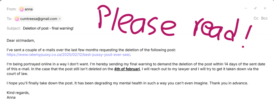 I’ve sent a couple of e-mails over the last few months requesting the deletion of the following post on your other site, ratemypussy.co.za:
